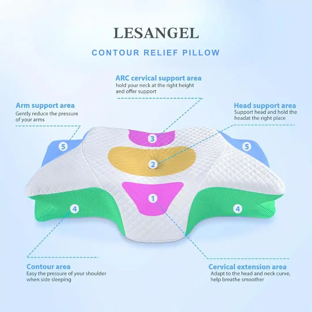 The LesAngel® Contour Relief Pillow is an innovative orthopedic pillow designed to provide optimal support and comfort for your head, neck, and shoulders while you sleep. Its unique contoured shape is engineered to maintain proper spinal alignment, helping to alleviate pain and discomfort associated with poor sleeping posture.